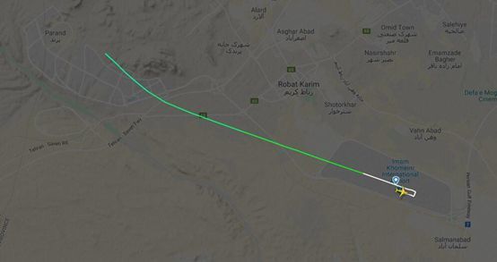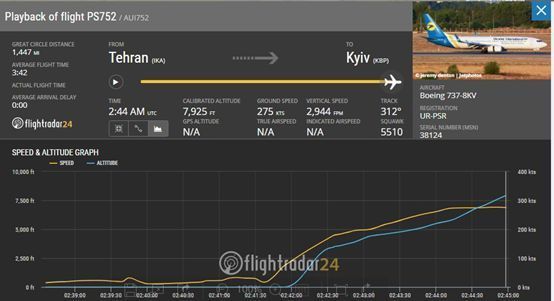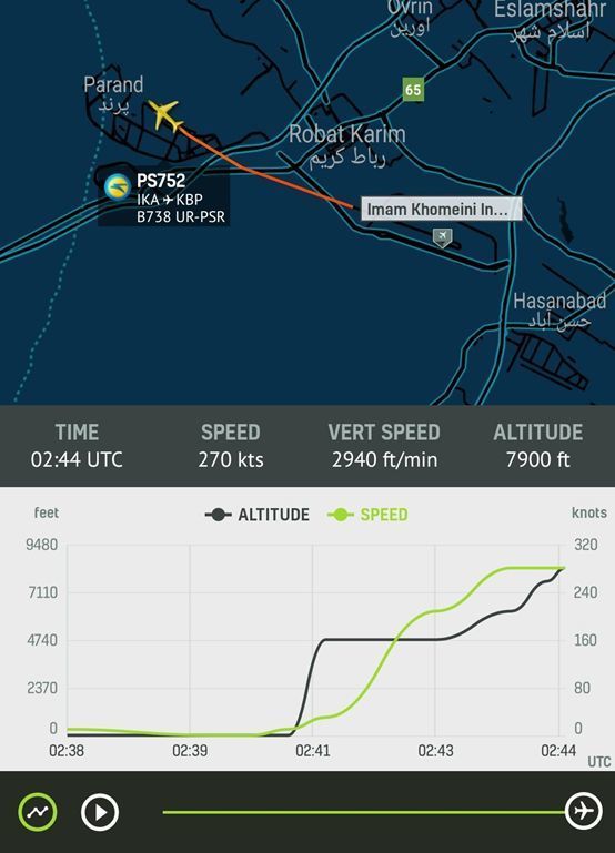 首先我們看這架飛機(jī)的情況,這架飛機(jī)航班號(hào)PS752,執(zhí)行伊朗首都德黑蘭到烏克蘭首都基輔的飛行,飛行途中將經(jīng)過土耳其臨空,飛機(jī)從德黑蘭機(jī)場起飛時(shí)間為02:42UTC(國際時(shí)間,伊朗當(dāng)?shù)貢r(shí)間是05:42,接近清晨,但是看不到陽光),僅僅2分鐘后飛機(jī)墜毀,證據(jù)是飛機(jī)信息廣播系統(tǒng)ADS-B在02:44UTC停止工作。